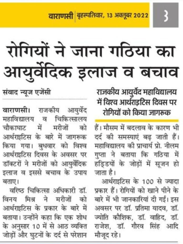 रोगियों ने जाना गठिया का आयुर्वेदिक इलाज – डॉ अजय गुप्ता ने विश्व अर्थराइटिस दिवस पर मरीजो को दी सलाह